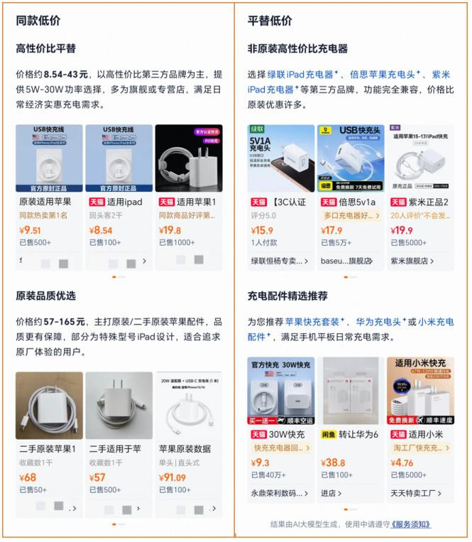 再以iPad充电线为例,同款低价列表中既有8.54元的高性价比第三方产品,也有165元的原装配件,价格跨度覆盖了不同消费需求,消费者可根据自身需求灵活选择。