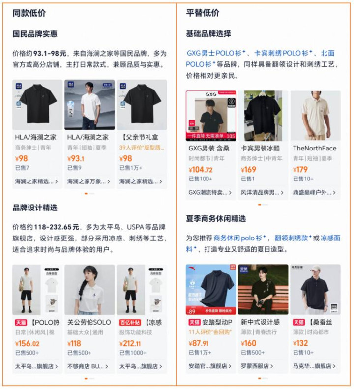 男装类目的使用体验则更为顺畅,以搜索太平鸟品牌Polo衫为例,进入AI比价的同款低价板块后,系统不仅会推荐200元左右的品牌同款产品,还会主动给出“国民品牌实惠”的选购建议。
