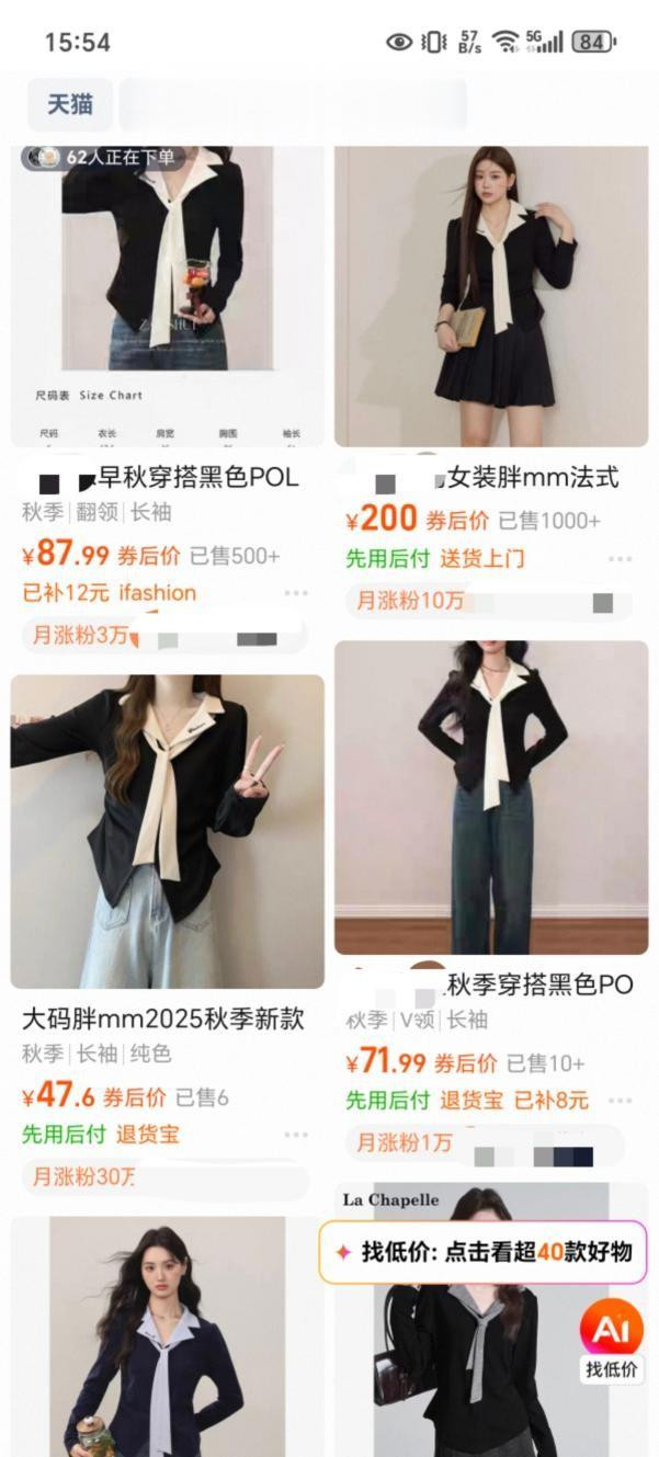 而女装及部分无品牌男装,即便经过AI比价筛选,仍需手动进一步判断,这类产品中可能存在盗图、以次充好的情况,低价背后往往是面料粗糙、做工劣质等问题,不能单纯依赖推荐结果下单。